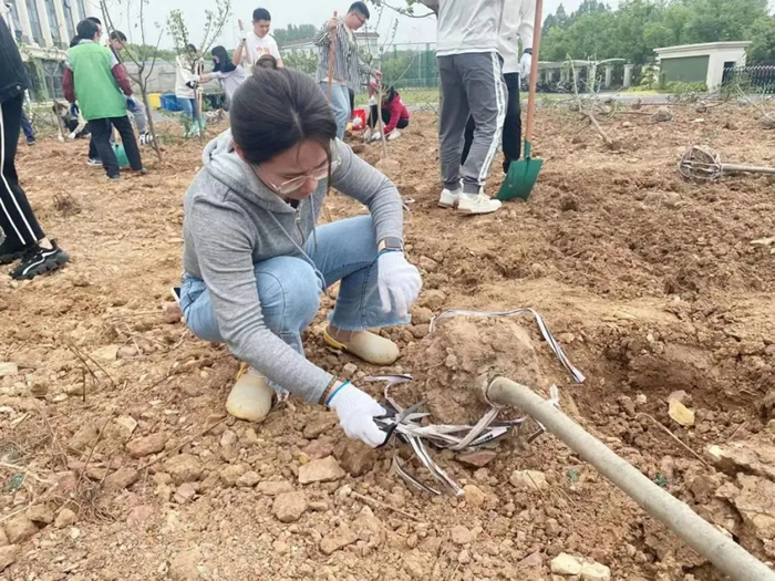 除土球布條、挖坑、扶樹、填土、檢查調(diào)整......紙上得來終覺淺,覺知此事要躬行??油诘没蛱罨蛱珳\,埋樹根時(shí)或太松或太實(shí),凡此種種細(xì)節(jié),都會影響樹苗成活率,大家也虛心聽從綠化師傅們的意見,耐心調(diào)整,并很快得心應(yīng)手起來。
