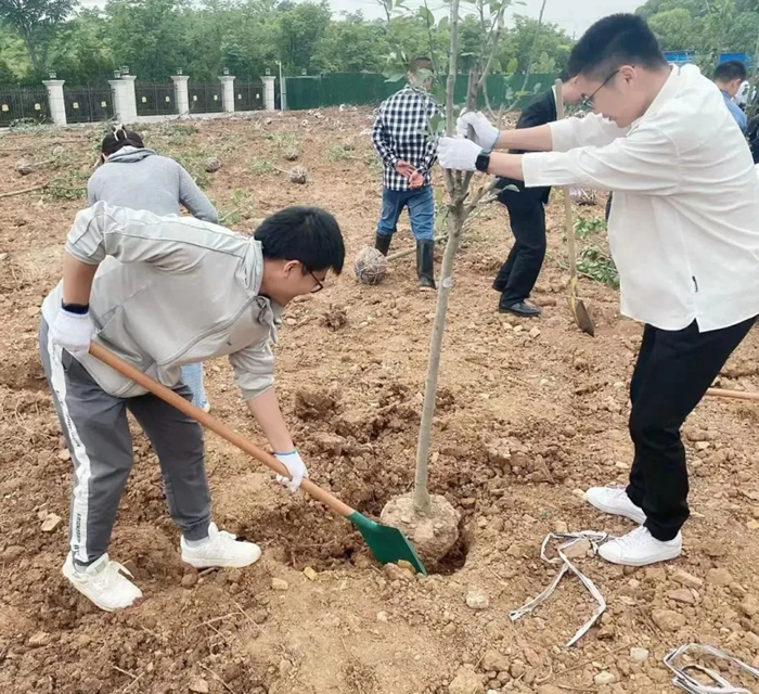 隨著植樹的逐漸熟練,管理干部們也自然而然地將標(biāo)準(zhǔn)化的思路融入到植樹活動中:先由指定人員集中完成土球除布條和挖坑工作,再由一人扶樹,3-4人一同埋土,僅需半分鐘,即可種好一棵樹。三百多棵樹很快如雨后春筍般林立了起來。