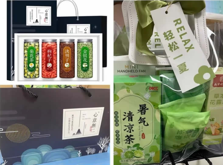 每位現(xiàn)場的高溫作業(yè)人員都收到了一份高溫防暑禮包:蒸汽眼罩、濕巾、防蚊膏、暑氣清涼茶、冰涼貼、風(fēng)扇、花露水;以及一份夏日養(yǎng)生茶禮盒:菊花茶、枸杞子、決明子、金銀花。