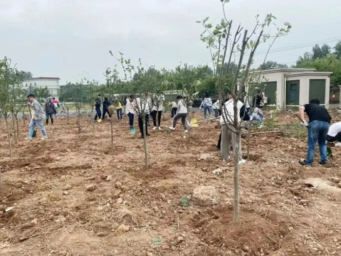 隨著植樹的逐漸熟練,管理干部們也自然而然地將標(biāo)準(zhǔn)化的思路融入到植樹活動中:先由指定人員集中完成土球除布條和挖坑工作,再由一人扶樹,3-4人一同埋土,僅需半分鐘,即可種好一棵樹。三百多棵樹很快如雨后春筍般林立了起來。
